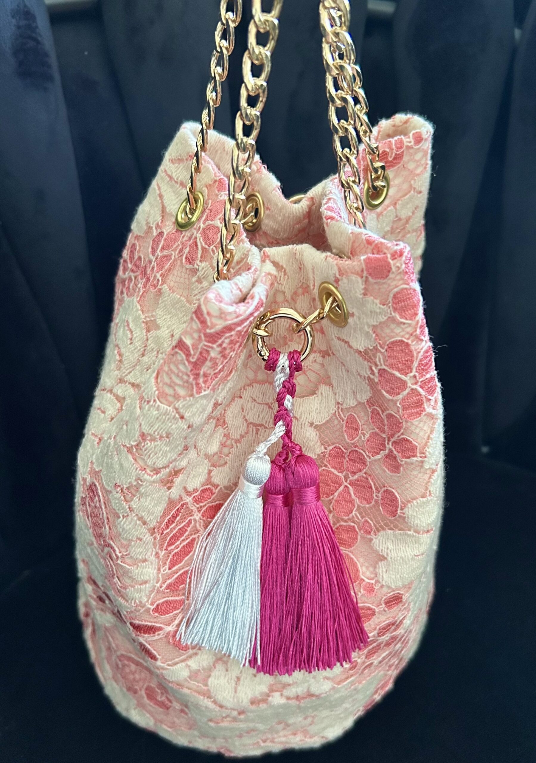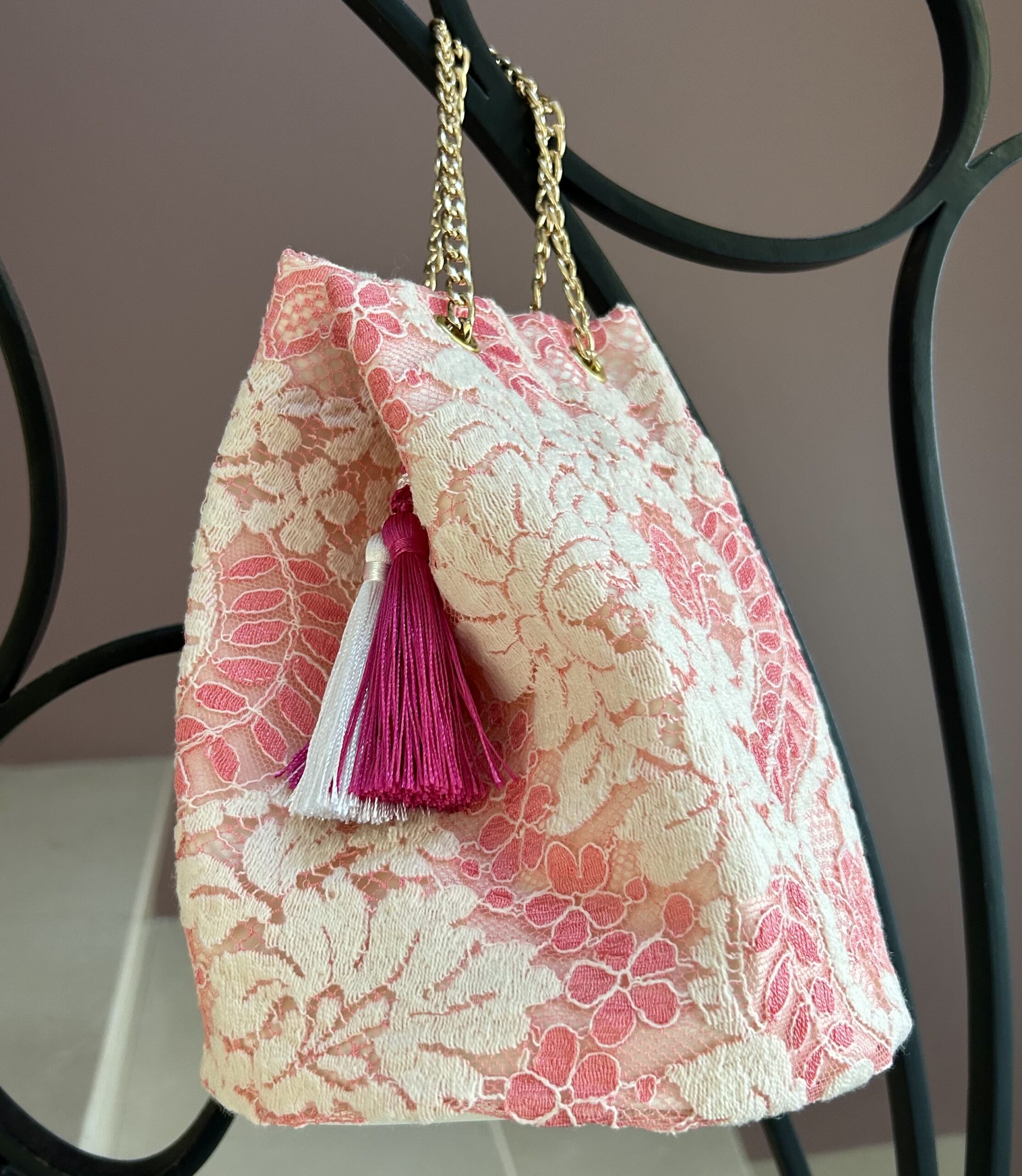 Découvrez notre sac dentelle rose & blanc en dentelle de Calais-Caudry.